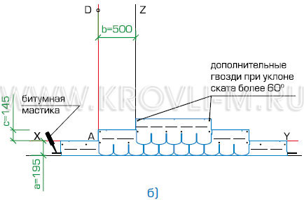 Фиксация (крепление) листовДля крепления гибкой черепицы АНТИК используются гальванизированные кровельные гвозди (FeZn) улучшенного прилегания (ершеные, крученые) с гладкими широкими шляпками (диаметр гвоздя 3,2 мм, диаметр шляпки 10 мм). Длина гвоздей зависит от толщины и типа обрешетки. Каждый лист черепицы АНТИК крепится 4 гвоздями (ось гвоздей на линии битумных клеевых полос) таким образом, чтобы гвоздь прошивал и верхний край низлежащего листа черепицы (рис. 2б). При укладке черепицы на скатах при уклоне больше 60° лист должен крепиться 6 гвоздями (2 дополнительных гвоздя фиксируют верхние углы листа на расстоянии от краев 2,5 см).